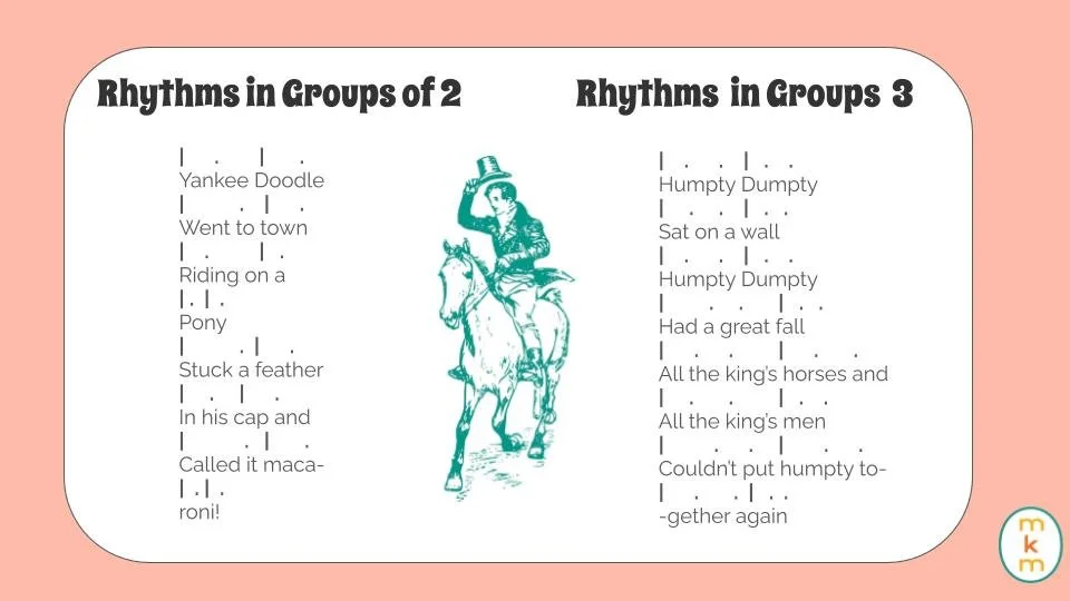 We develop familiarity with rhythmic patterns through simple songs, nursery rhymes, and familiar music. In time, we remember those patterns and they become a part of our rhythmic vocabulary!